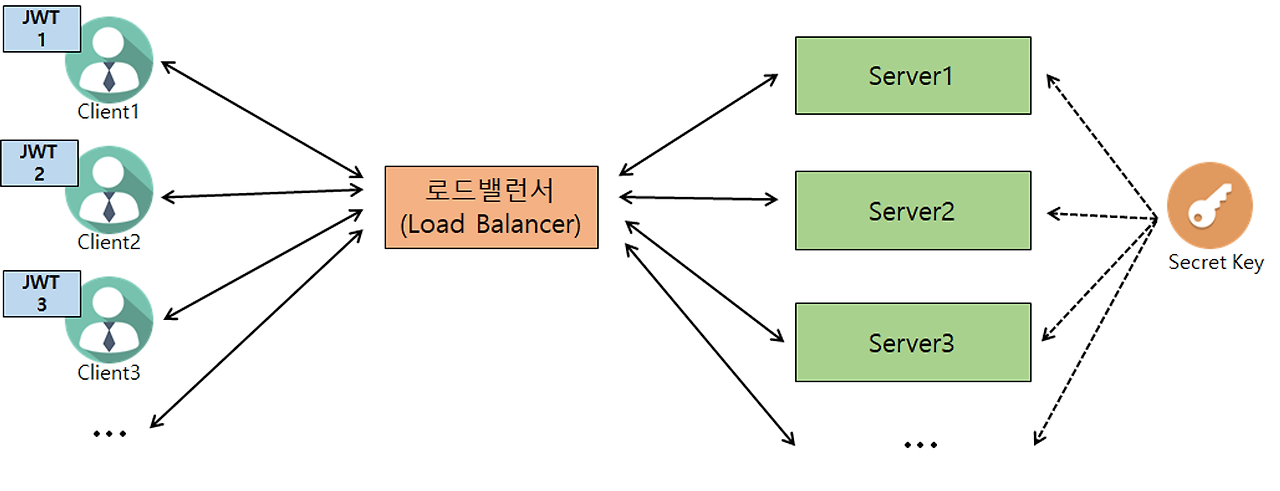 이러한 문제를 해결하기 위해 Session storage를 생성하여 모든 서버에 로그인 정보를 공유할 수 있도록 한다. session storage 방식으로 secret key를 JSON 방식의 토큰을 사용하는 것이 JWT의 개념이다.