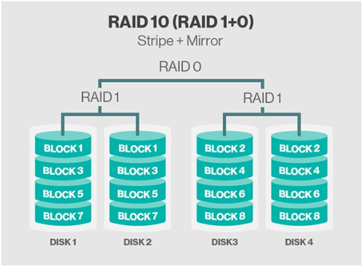 RAID 0 + RAID 1 을 합한 능력과 같은 RAID 1 세그먼트를 스트라이핑하여 매우 높은 I/O 속도를 제공한다. 최대 성능 및