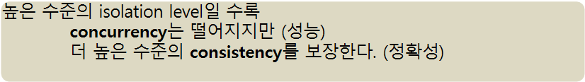 3. Isolation(격리성, 고립성) : 각 트랜잭션은 다른 트랜잭션의 수행에 영향을 끼치지 않아야 함