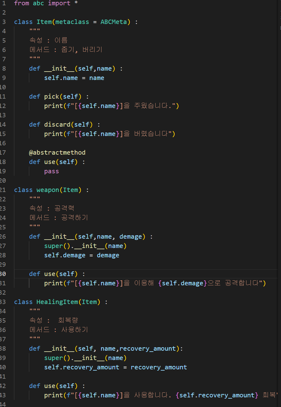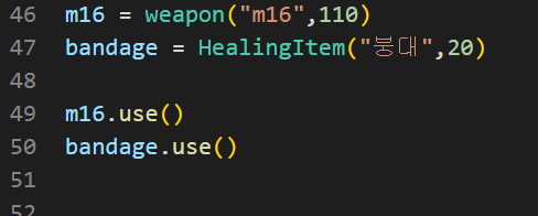 위의 코드에서 부모클래스는 Item을 상속받는 weapon 클래스와 HealingItem 클래스로 이루어져 있다. 추상 메소드는 use로 부모 클래스인 Item 클래스에는 메소드 선언만 해주었고, 자식클래스인 weapon 클래스와 HealingItem 클래스에는 각각 다르게 표현하였다.