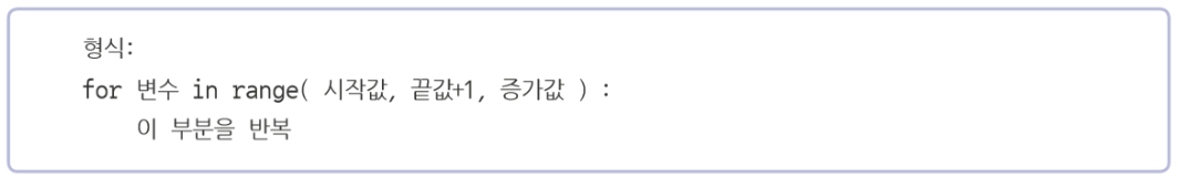 반복문은 range() 함수를 통해서 통제가 가능한데 range(0,10)이면 0부터 9까지 반복하겠다는 의미 이다. range(0, 3, 1)은 0에서 시작해서 2까지 1씩 증가하는 값들을 반환하므로 0,1,2를 반환한다.시작값과 증가값은 생략할 수 있는데 시작값을 생략시 0, 증가값 생략시 1으로 간주한다. 그러므로 , range(0, 3, 1), range(0, 3), range(3) 모두 동일하다