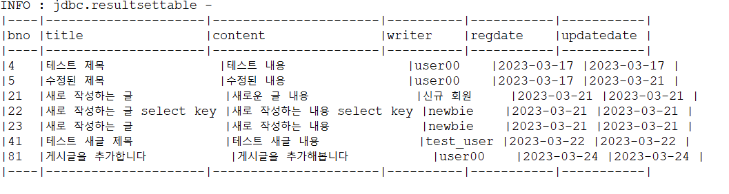데이터를 잘 넣고 JUnit 실행결과가 문제가 없다면 getList를 실행했을때, 다음과 같은 결과가 출력된다.