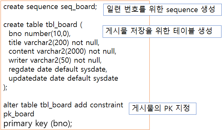 MySQL이나 OracleDB 에서 데이터를 저장하기 위한 테이블을 생성해야 한다. 기본키(중복,NULL 값 X)를 위한 sequence를 먼저 생성해 준다. 그다음 게시물 저장을 위한 테이블을 생성한다. 테이블 안의 attribute의 데이터 타입과 NOT NULL 조건을 설정해 준다. 그 다음 기본키,외래키와 같은 제약조건을 설정해준다.